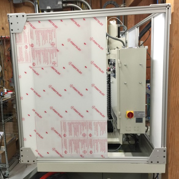I recently got a Tormach PCNC 770 CNC milling machine. So far, I’m very happy with it (but have not cut much yet). I figured that since I wouldn’t be using flood cooling, that I could get away without a full enclosure. But even with mist rather than flood, chips were shot everywhere, so I decided to roll my own enclosure using 80/20 parts https://www.8020.net/