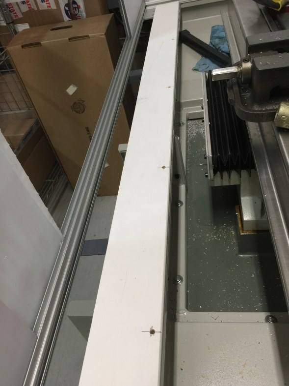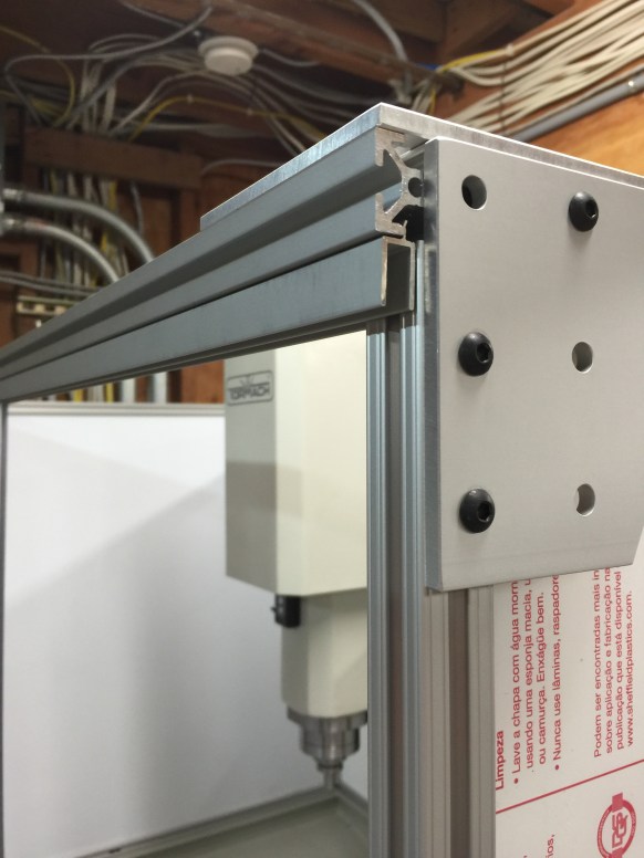 I got some wood trim panels to build support for the aluminum cover of the “porch”. The lower board (shown above) has to be about 3/8″ thick so that its top edge lines up with bottom of the slot in the 80/20 rails. A wider board that sits on top of that (shown below) is 0.18″ thick marker board cut into two 5″ x 30 sections (I couldn’t get a 60″ long piece). These slide into the 80/20 slots on front and the sides. After I glued this up, I had to partially disassemble the frame to fit it in. I might have been able to bow it, but I didn’t want to risk breaking what I just made.