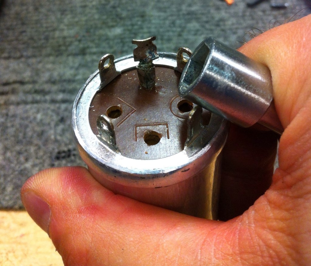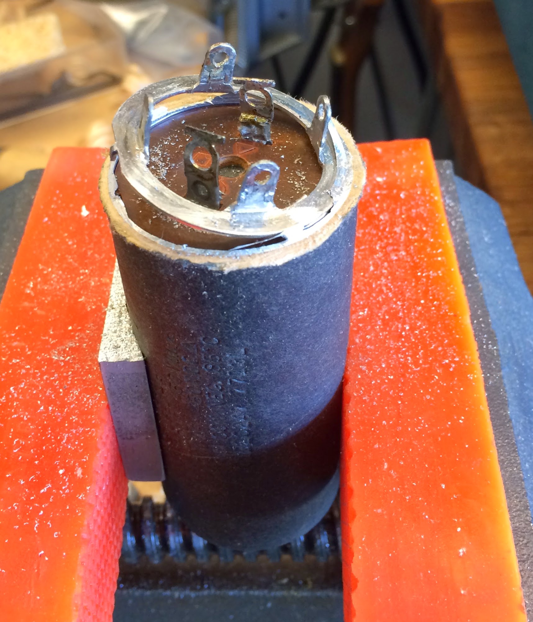 After removing the capacitor, the first step is to carefully file off the flange that holds the terminals in place. Go slowly and take off as little material as possible. Note that following pictures are not from the same capacitor – I’ve done this a dozen or more times, but didn’t get a series of shots from one operation. Another thing to note in the below photo, I didn’t remove the paper sleeve before filing. That was a mistake.