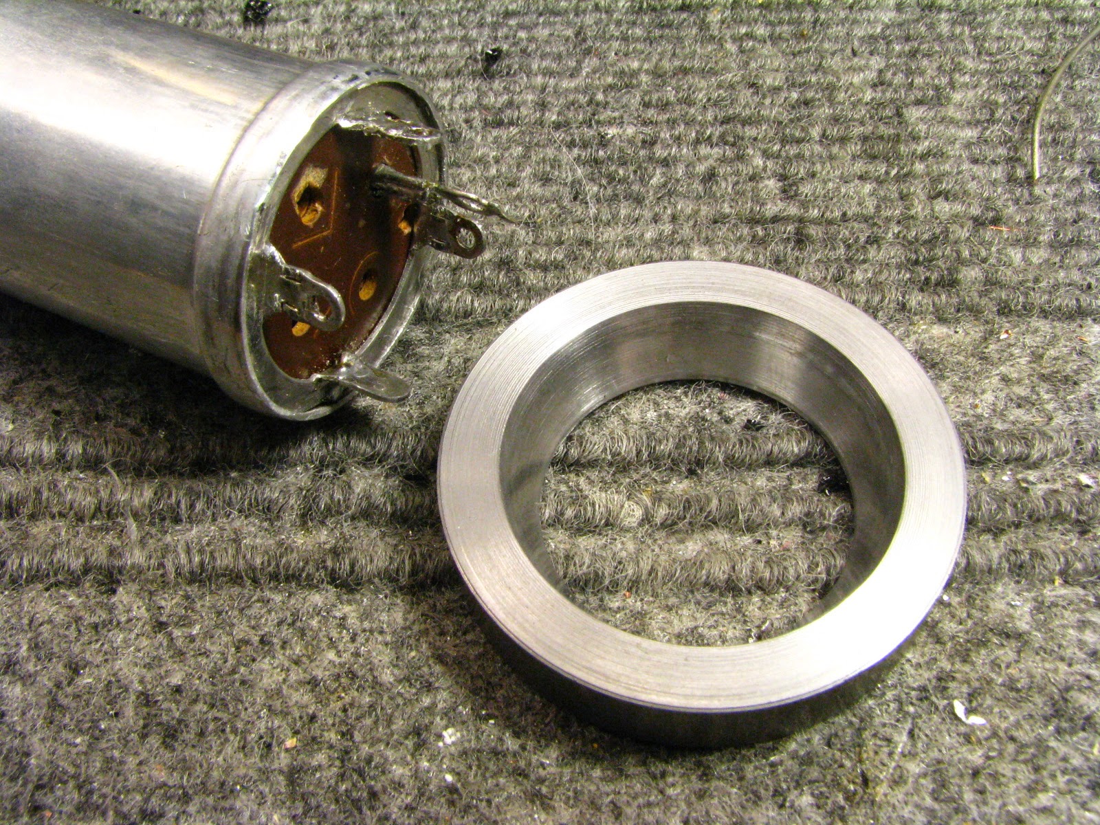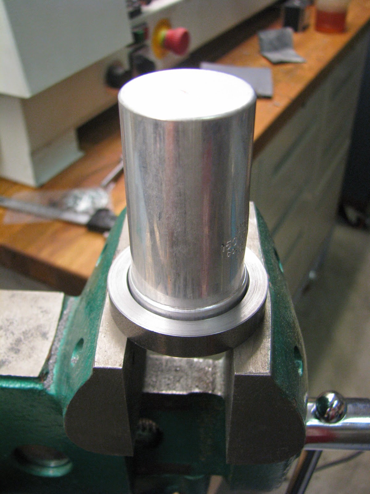 Once the can is back together, the end needs to be crimped over to hold everything together. I made tapered collar on a lathe that I use as a form. I gently hammer the the cap (protecting the top with a wooded block) into the taper. You can accomplish the same thing (with slightly rougher finish) by gently hammering and burnishing the flange with a round tool.