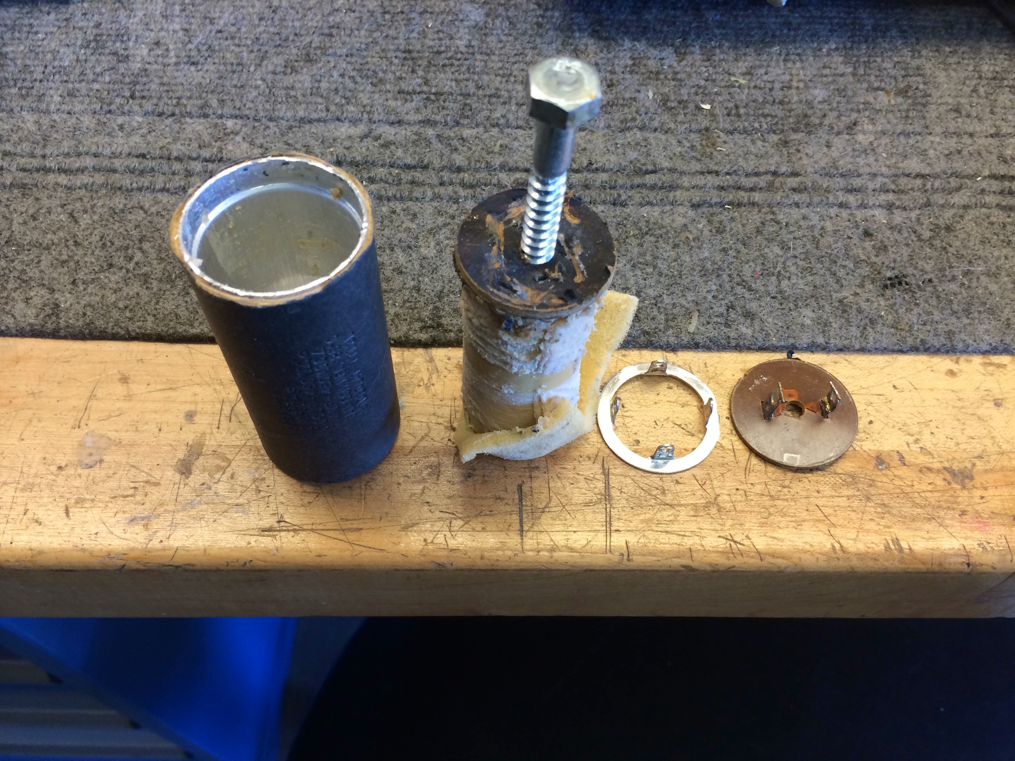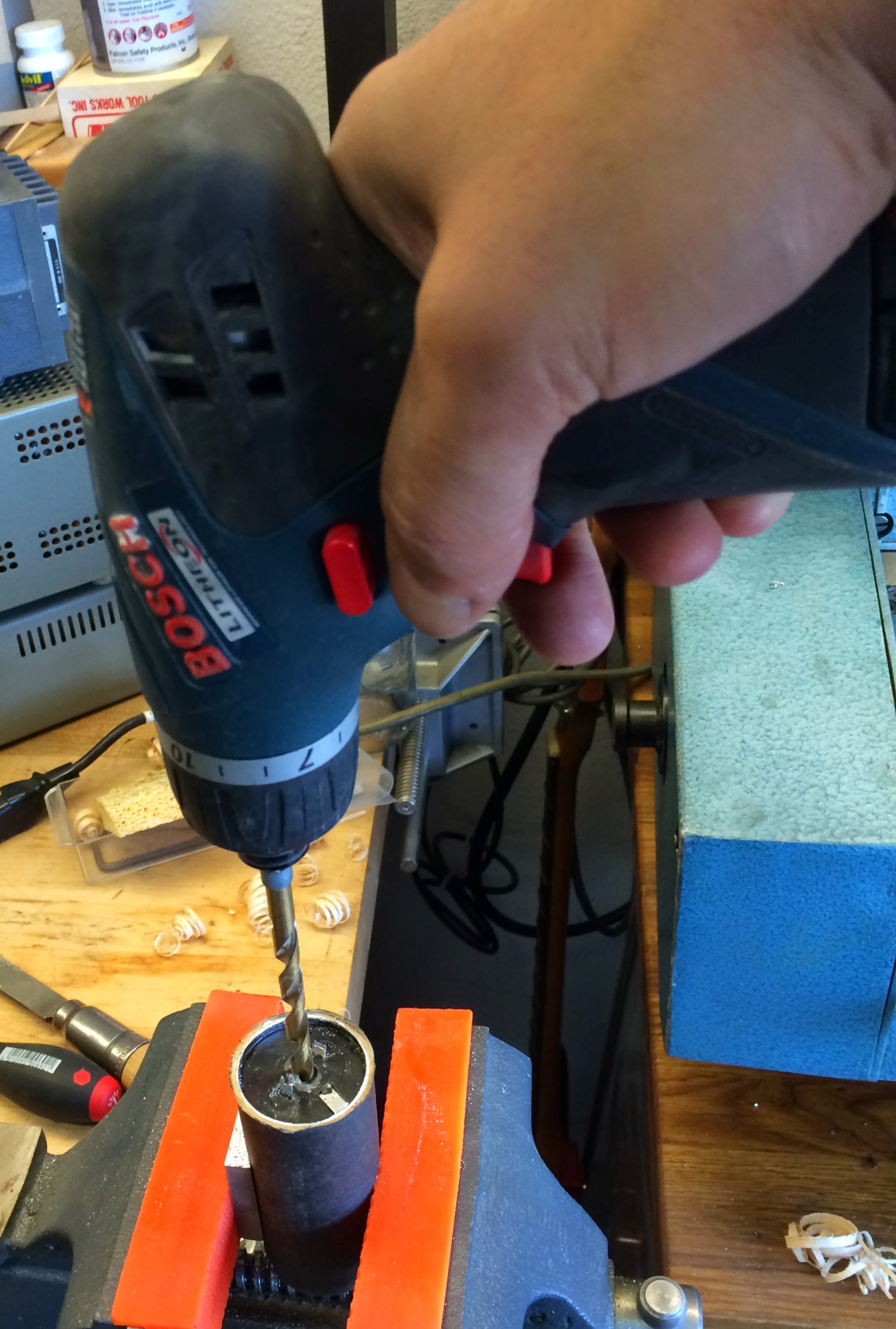 When you have the ring and phenolic disk(s) out, drill a hole into the casting goop to fit the lag bolt in the next step. Don’t be shy. The cap internals are already history.