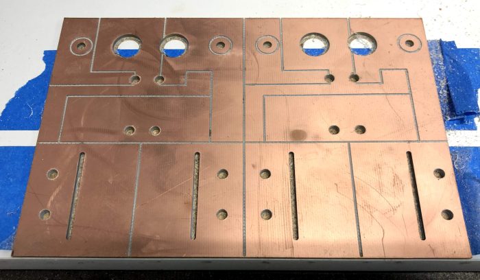 In order to mount the new binding posts, I needed to pull out the old plastic terminals and crossover parts. After hand drawing out the new crossover circuit (see link above) on a copper-clad board (see below), I cut it on my CNC, but it wouldn’t be that hard to cut it by hand. I used single-sided copper-clad so that the un-clad side could mount directly against inside the speakers’ metal case.