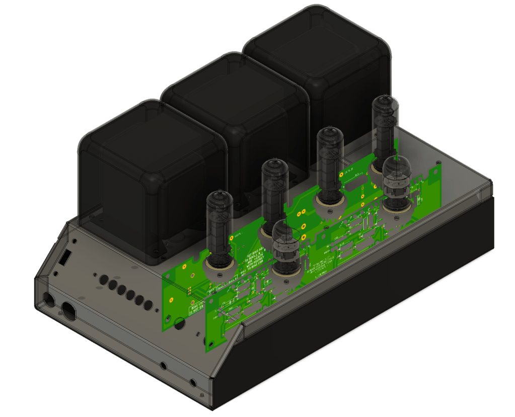 I created as complete a 3D model as I could. This included chassis metal, transformers, tube sockets, tubes, brackets, etc., as well as printed circuit boards imported from Autodesk Eagle. Some part models could be found online from sites like Grabcad, while others had to be created. There were months of playing with positions and nudging parts around before I settled on final positions.