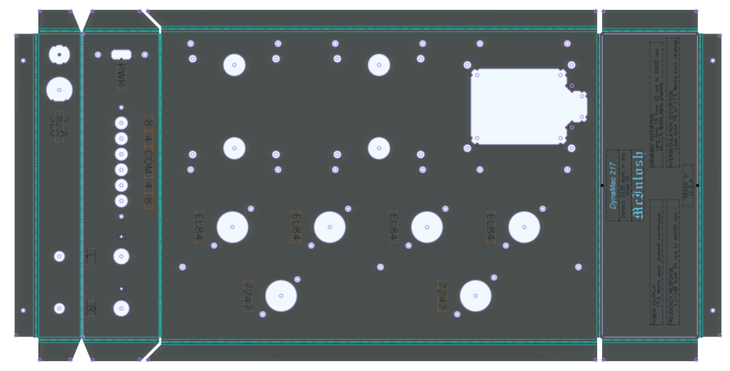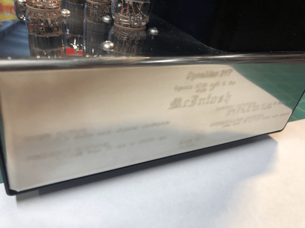 As shown below, I also tried to mimic the McIntosh rear lettering with laser etching. Results were not great, but someone who looks closely can just make out the text. It says, “DynaMac 217, Dynaco ST35 built in the style of McIntosh”. Below that are the Dynaco ST35 specs from their documentation, printed in the same locations that the McIntosh specs would be.