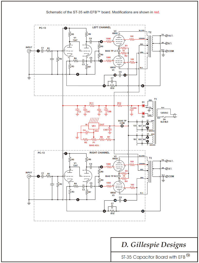 In addition to the basic ST35 circuit, I implemented an upgrade known as “Enhanced Fixed Bias (EFB)” devised by Dave Gillespie, which is described in detail here: http://www.tronola.com/A_New_Look_At_An_Old_Friend.pdf