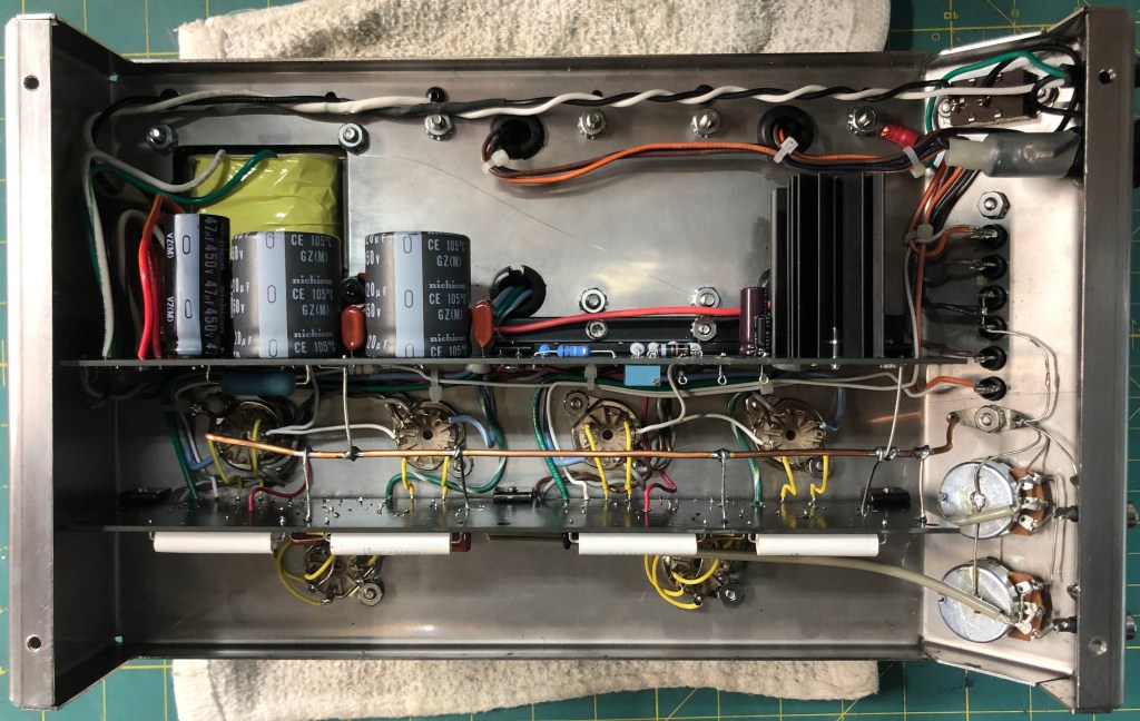 The below picture shows the amp PCB. Eagle eyed viewers will notice the “X” pattern jumper wires between the large white capacitors. It turns out that when you connect the coupling caps to the wrong output tubes you end up making a 17 Watt power flip-flop! Ooops. At this point I thought about ordering new boards, but perfection is the enemy of the good, and I was too close to the finish line.
