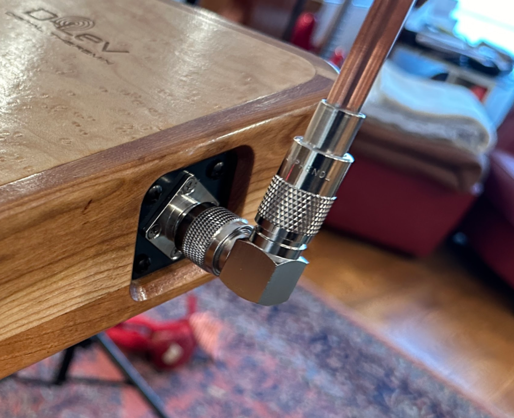 The antennas are 3/8″ copper tubing soldered to UHF connectors. The volume antenna is formed from soft copper tubing that comes in a roll, while the pitch antenna is a section of straight copper tube. UHF connectors are well suited because they don’t move when tightened, and have teeth that allow them to be locked in at 22.5 degree increments so antenna orientation can be adjusted independent of D-Lev case position.