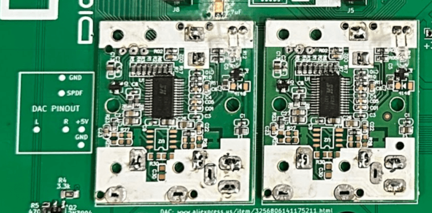 The original D-Lev design outputs SPDIF and TOSLINK digital audio outputs which require an external DAC to generate an analog signal to drive an amp/speaker. In this single-board design, I added two DAC boards and line/headphone amps that output analog signals for the LINE and MONITOR outputs on ¼” phone jacks. The DACs board are harvested from low cost Ali Express DAC modules: https://www.aliexpress.us/item/3256806141175211.html