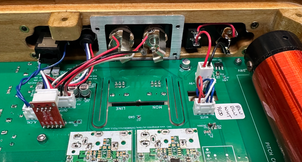A few tricks were needed to get controls and displays with different heights to fit up behind a single flat front panel. The encoders and volume pots had different heights so I laid out a flexible “snake” routing in the PBC that allowed the pots to sit a few mm lower than the main board without requiring a connector.